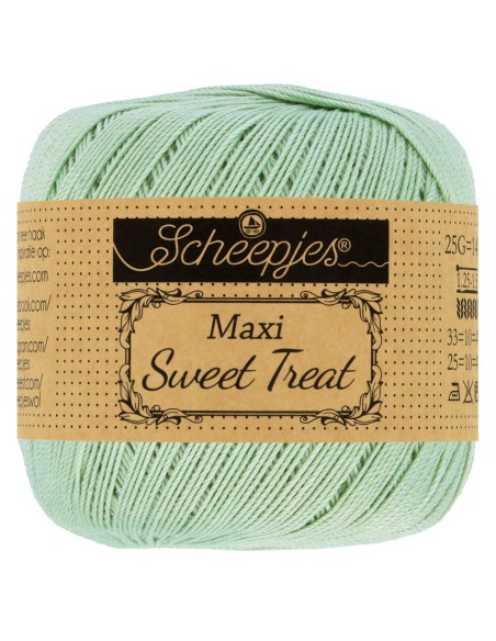 Scheepjes Maxi Sweet Treat is evenals Scheepjes Maxi Sugar Rush een zeer fijn (garendikte Lace) gemerceriseerd garen van 100% katoen. Scheepjes Maxi Sweet Treat heeft een subtiel glansje en een sterk getwijnde draad, waardoor het brei- of haakwerk een fraaie gladde afwerking krijgt. Dit fijne garen is ideaal voor opengewerkte brei- of haakpatronen, zoals ajourbreien, kantbreien of filethaakwerk, maar natuurlijk ook voor luchtige kleding of accessoires. Bij de productie is gebruikgemaakt van een volledig biologische afvalwaterzuivering, waardoor het gebruikte water op een veilige manier wordt gerecycled en hergebruikt. Scheepjes Maxi Sweet Treat heeft het EN 71-3 keurmerk, wat aangeeft dat dit garen veilig is in gebruik voor personen met een gevoelige huid en met name voor speelgoed voor baby's en kinderen. Dat maakt dit garen tot een verantwoorde keus voor bijvoorbeeld babydekentjes, knuffels of amigurumi. Scheepjes Maxi Sweet Treat, Maxi Sugar Rush en Maxi zijn identieke garens, maar elk met een andere looplengte. Scheepjes Maxi Sweet Treat is verkrijgbaar in 87 verschillende kleuren. De aanbevolen naalddikte is 1.25-1.50mm. Een bol weegt 25 gram en heeft een looplengte van 140 meter. Geleverd per 10 bollen.