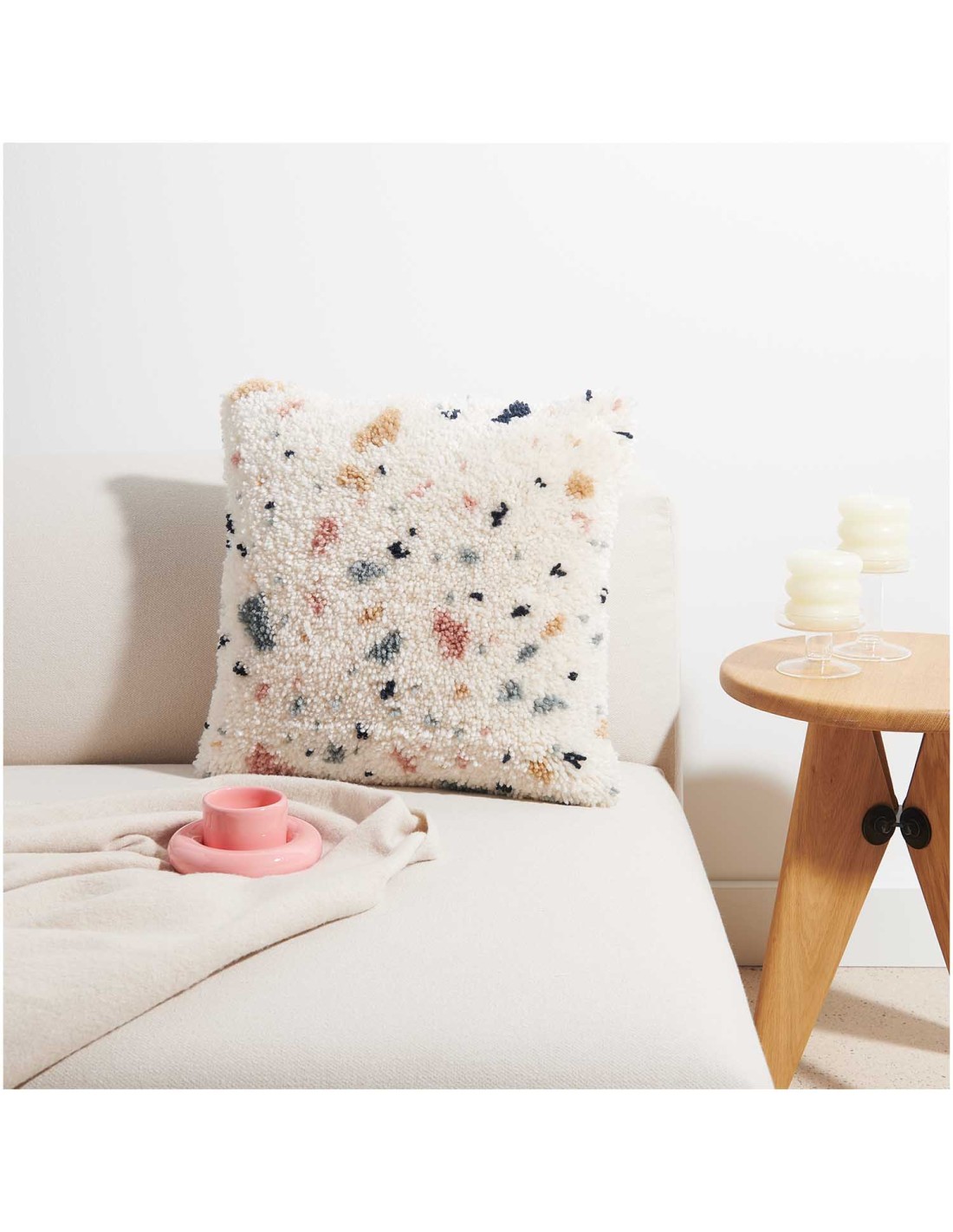 De Rico Hooki Hooki Knoopset Kussen Terrazzo is een set waarmee je een mooi terrazzo-patroon maakt voor een kussen. Het pakket bevat alles wat je nodig hebt: een canvas met het terrazzo-ontwerp, voorgesneden garen in bijpassende kleuren, een knoopnaald en een eenvoudige handleiding. Het is een ontspannen en creatieve activiteit die geschikt is voor zowel beginners als gevorderden, en het resultaat is een uniek kussen dat je interieur een moderne uitstraling geeft.